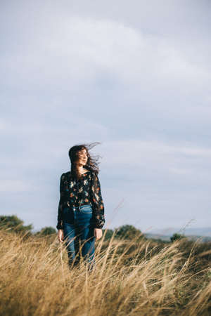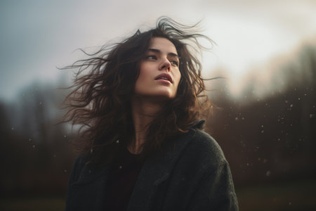 A young woman stands with her head tilted slightly, her hair blowing in the wind. She gazes thoughtfully into the distance, with a soft expression that reflects contemplation.