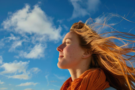 A woman looking up, her hair blowing in the wind against a blue sky, portraying freedom, thoughtfulness, or aspiration
