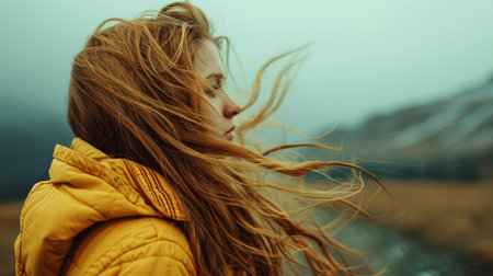 Conceptual image of a girl's close-up amidst the mountains, her hair blowing in the wind, capturing a serene moment amidst nature's grandeur Generative AI