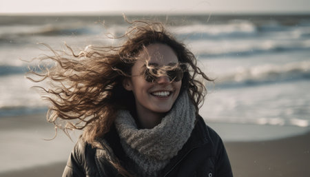 A young woman with long, dark hair stands on a beach, her smile illuminated by the wind whipping through her hair.