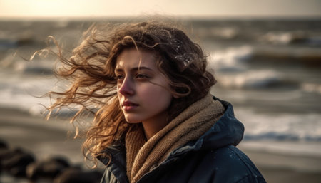 Young girl, wearing casual clothes, photographed on the beach in winter.