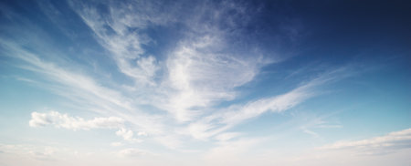 Light cirrus clouds in the blue sky panorama. Cirrus clouds variety on a sunny day. Wide shot of beautiful calm skyscape. Background for weather and climate concept. Outdoors.