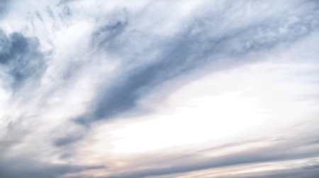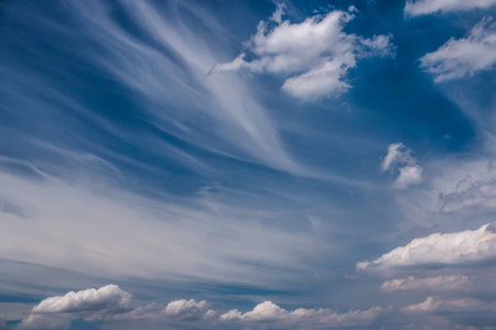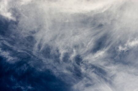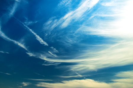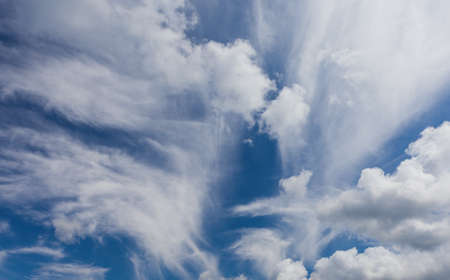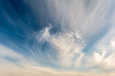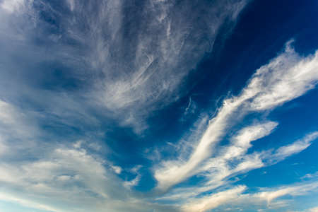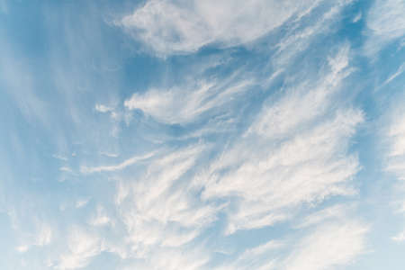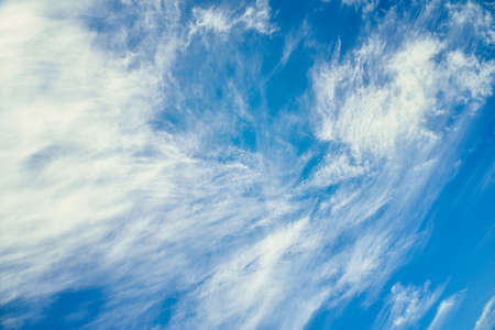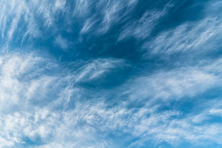 Blue sky and white cirrus clouds background. Amazing spindrift clouds. Natural backdrop.