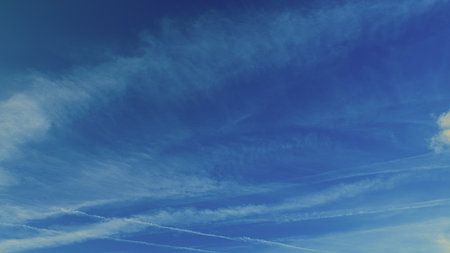 View of aircraft contrails and cloud clouds against blue sky
