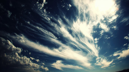 A dynamic sky filled with streaky, wispy clouds illuminated by bright sunlight, creating a sense of movement and awe.