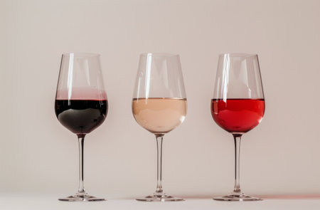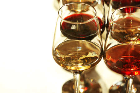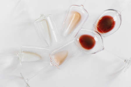 glasses of wine half full on the white window, white and red wine ready for degustation
