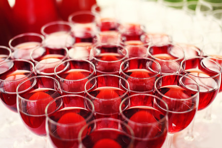 Group of glasses with cherry juice on the table . glasses of cherry juice .Row of Glasses with Fresh cherry Juice. Catering concept. Bokeh blurred background. Selective focus .