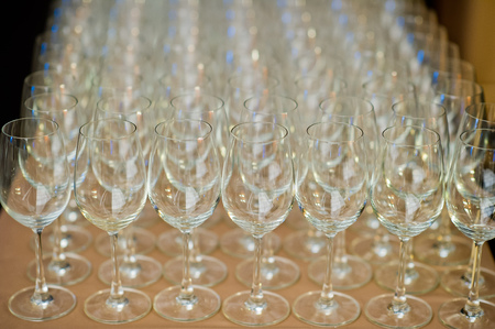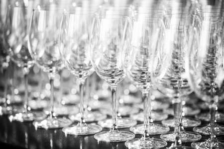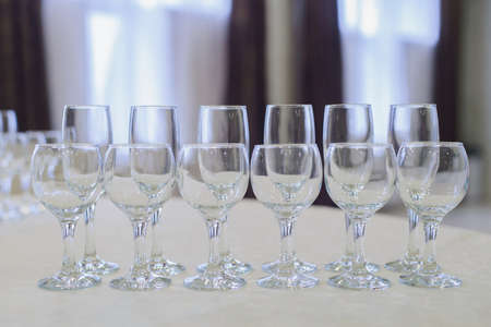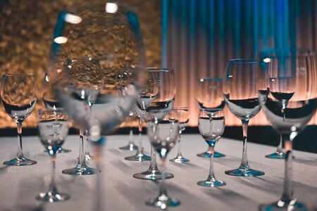 Clean glasses on a table prepared by the bartender for champagne and wine. Several of transparent glasses on a rack. Catering for the event preparation, clean glasses for drinks. Soft focus.