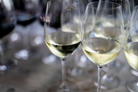 Close up of glasses of champagne on the table with shallow depth of field. Banquet black table with white wine