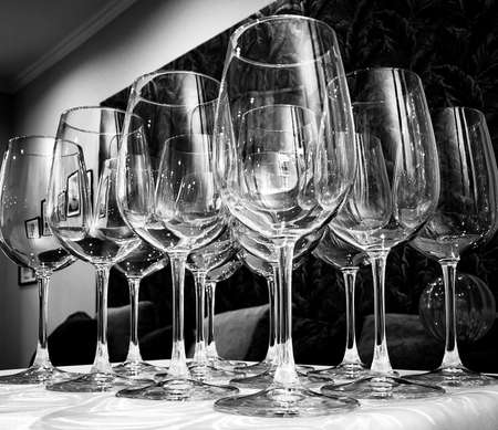 Crystal clean wine glassware on the barmens table is waiting for customers.