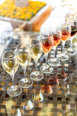 Wine tasting set in the light summer environment. Custom wine tasting concept. Glasses of wine on the glass table and outdoor background