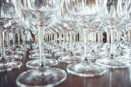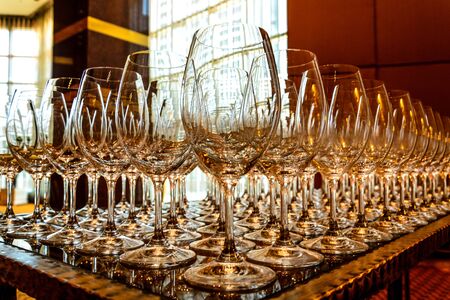 empty wine glasses. Beautiful new glasses for wine from glass stand in even rows on a wooden table in a restaurant. selective focus
