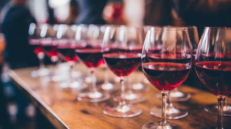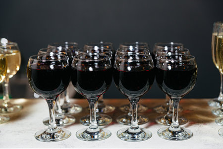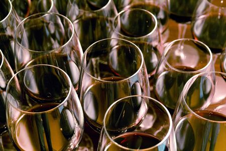 A lot of wine glasses with a cool delicious red wine at the bar or event catering. Alcohol background.