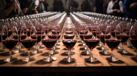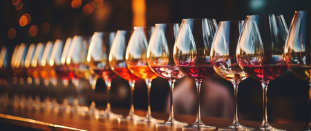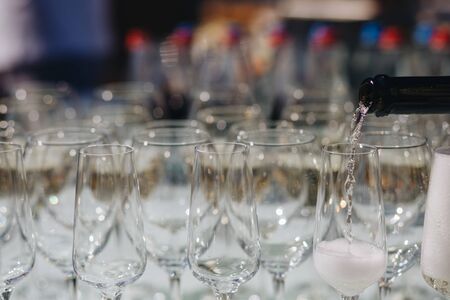 Wine glasses in a row. Pouring wine. Buffet table celebration of wine tasting. Nightlife, celebration and entertainment concept. Horizontal, wide screen banner format
