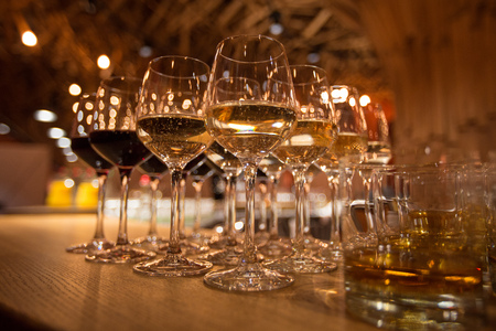 Nine glasses of wine set on table in the restaurant . Shallow depth of field, very soft image