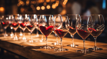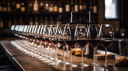Wine glasses on a bar counter in a restaurant. selective focus. Generative AI.