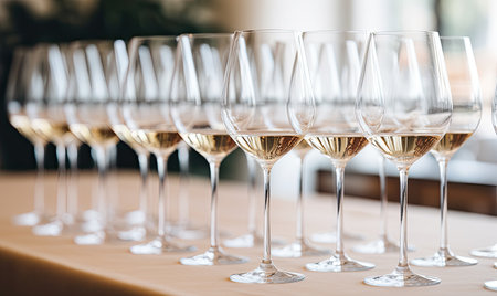 A stunning array of crystal wine glasses arranged in an elegant line against a soft light background. Perfect for enhancing dining, entertaining, or event themes.