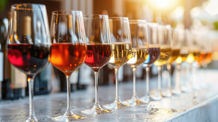 Several glasses of ros wine are arranged artistically on a soft surface, reflecting warm sunlight creating a pleasant ambiance during a relaxing afternoon gathering.
