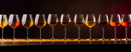 A closeup shot of a row of wine glasses on a table. The glasses are filled with a variety of wine colors, including red, amber, and white.