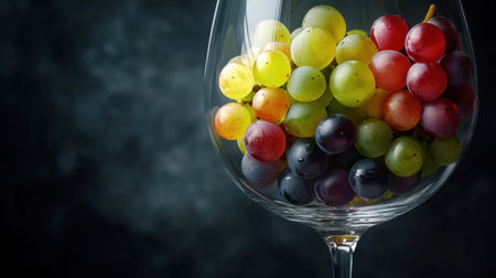 Still life. Glass of red wine and an assortment of ripe and juicy grapes in a wooden box. Growing organic fruits for sale in farmers markets and. Concept of wine industry. Viticulture. Vine growing