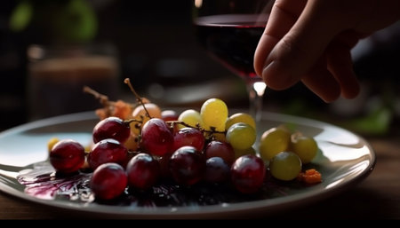 A close-up shot of a plate with red and green grapes, a glass of red wine, and a hand reaching in to grab a grape.