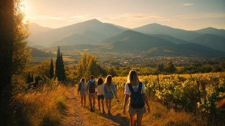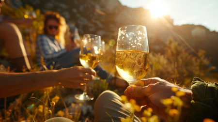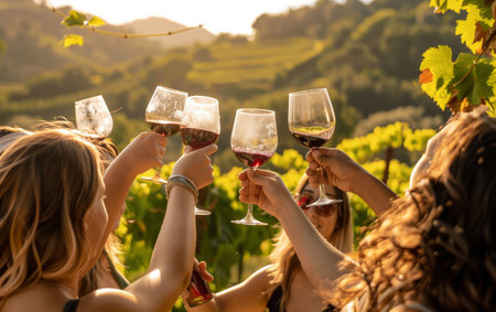 Group of friends enjoying a wine tasting and sunset toast in a beautiful vineyard. Raising their glasses during the golden hour. Celebrating the summer outdoors surrounded by nature. Vineyards