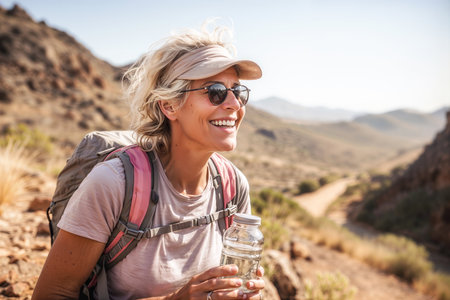 Smiling woman in sunglasses enjoying a break with a water bottle during a hike in arid terrain
