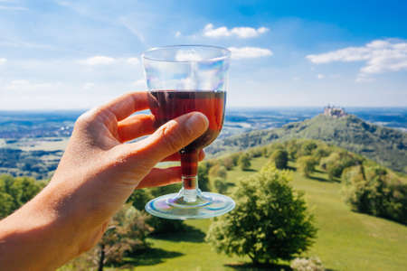 Close up of glass with red wine over landscape of caucasus mouintains in sunny day, Elbrus