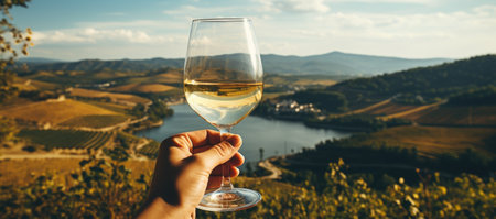 A close-up shot of hands holding a glass of red wine against the backdrop of beautiful grapevines and rolling hills. Generative ai