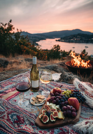An outdoor scene showcases a picnic setup with wine, fruit, and snacks. The composition features a colorful blanket, food arrangement, and wine bottles and glasses. The warm light suggests a sunset ambiance, enhanced by a distant lake and hills. This image could be used for lifestyle, culinary, or travel content.