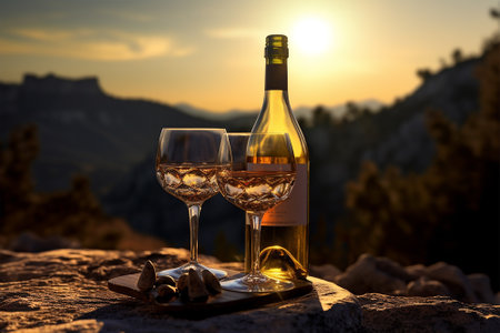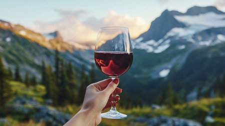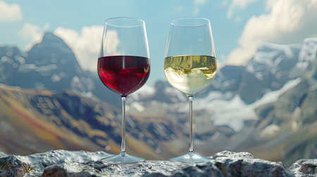 two wine glasses, one filled with red and the other with white wine, set against the backdrop of majestic mountains and lush nature, creating a photo-realistic oasis of relaxation