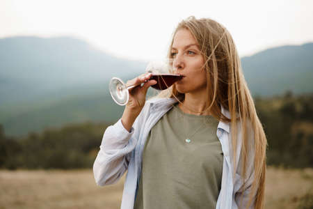 Woman examining white wine in wineglass through sunlight during sunset. Vintner drinking wine after successful grape harvest at autumn