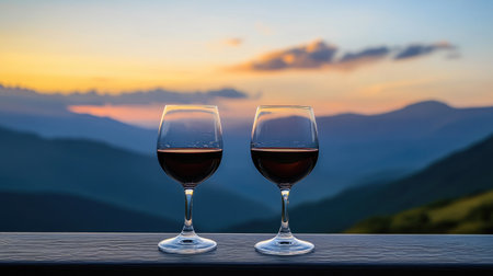 A scenic view of mountains with two wine glasses in the foreground, symbolizing a moment of relaxation and enjoyment