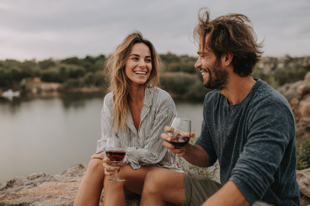 Happy woman enjoys wine while sitting on a rock with male friend near a serene lake during a cloudy evening