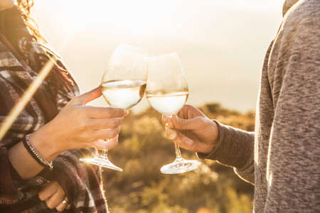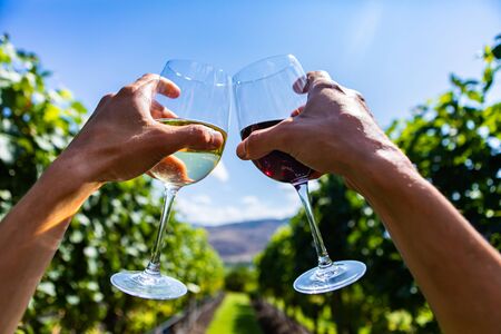 outdoor hands cheering red and white wine glasses selective focus close up, between vineyard grapevines green background and blue sky during sunny day