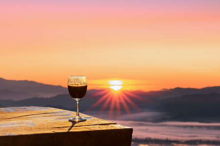 Red wine glass with the sunrise overlooking the mountains in northern of Thailand.
