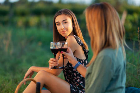 Beautiful girls tasting wine in a field near vineyard field. Celebrating successful harvest season. Couple having a romantic date. Rural tourism concept..