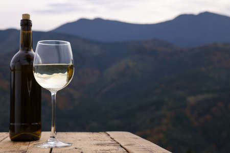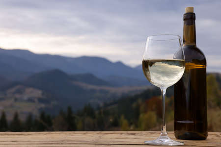 Glass and bottle of tasty wine on wooden table against mountain landscape. Space for text