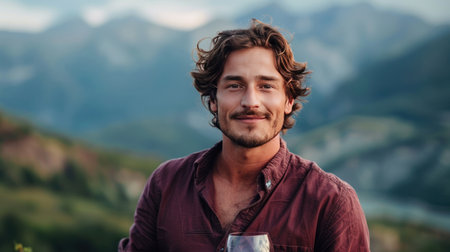 Portrait of a smiling young man holding a glass of wine in the countryside