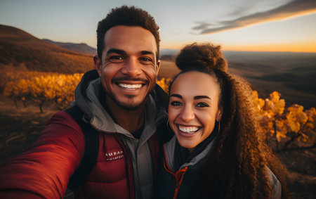 happy african american couple taking selfie with smartphone while hiking in autumn forest
