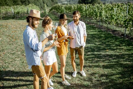 Group of young friends dressed casually having fun together, tasting wine on the vineyard on a sunny summer morning