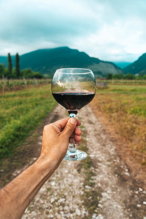 Glass of Red Wine with Scenic Vineyard Background in French or Italian Countryside