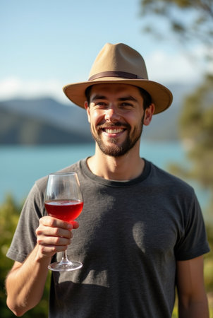 A smiling vineyard worker enjoys a glass of red wine amidst lush grapevines, capturing the essence of a joyful harvest in a picturesque outdoor setting.