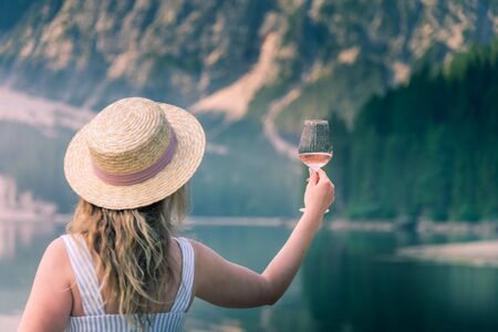 Lady traveler in a summer dress holding a glass of wine with Lake Braies and mountains on the background