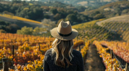 Vintner enjoying white wine in her vineyard at autumn. Woman wearing yellow knitted sweater and hat outdoors