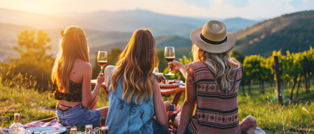 Young female friends enjoying a summer picnic while drinking wine and observing the sunset and hill landscape from behind.