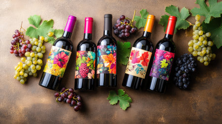 A stunning arrangement of colorful wine bottles showcasing artistic labels, surrounded by fresh grapes and green leaves on a golden surface. Perfect for celebrations.