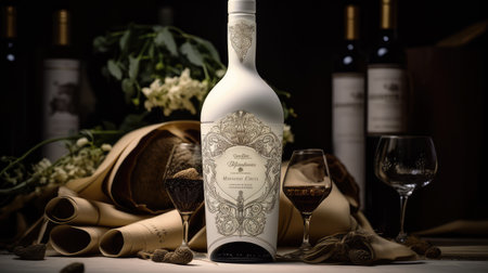 A bottle of wine sitting next to a glass of wine. AI generative image.