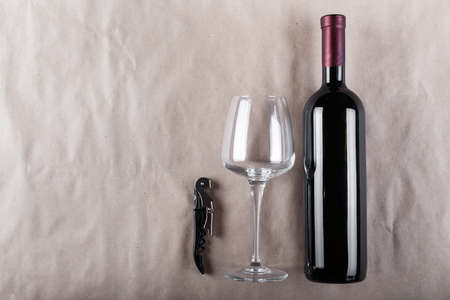 Wine set - A closed bottle of red wine with a corkscrew and a glass on a gray background