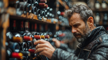 A focused mature sommelier chooses the perfect bottle of wine from a well-stocked wine cellar, highlighting his expertise and dedication.